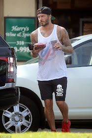 Brentwood yesterday. Beckham was spotted wearing a white sleeveless vest, a branded